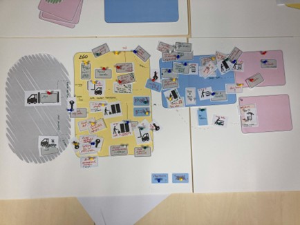 • Les trois premiers groupes portaient sur l’organisation des maisonnées et des résidences de l’EHPAD, son ouverture sur la ville / les tiers-lieux et l’accueil de jour, ainsi que l’organisation de la logistique et des fonctions supports. Les types de locaux et les schémas d’organisation fonctionnels ont été construits en séance par les participants à l’aide notamment de planches pré-élaborées par les programmistes. Des cartes « personna » ont permis aux participants de se mettre dans la peau d’utilisateurs et d’usagers type (résidents, familles), en fonction de situations données.
