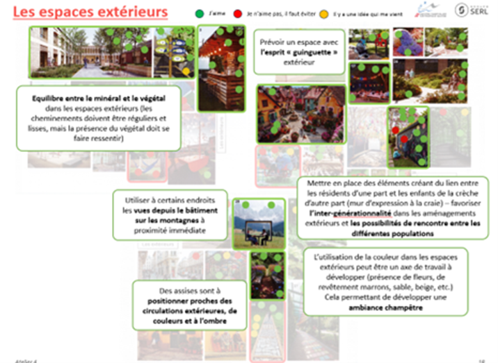 • Le 4ème groupe était axé sur les ambiances des espaces, les aménagements et le mobilier. Les utilisateurs ont pu exprimer leur avis sur les planches d’inspiration composées d’images réparties en différentes thématiques (chambres, circulations, locaux communs et espaces extérieurs). Les planches ont été laissées au Maître d’ouvrage pour que celui-ci puisse les afficher dans les EHPAD et permettre à l’ensemble des résidents de participer.